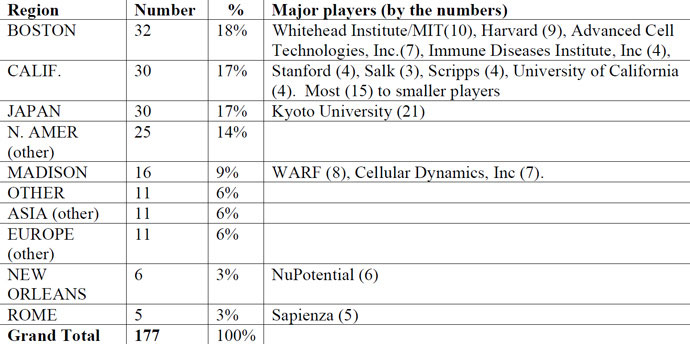 對數(shù)據(jù)進(jìn)行進(jìn)一步的分析,結(jié)果表明,一個地區(qū)的商業(yè)及學(xué)術(shù)氛圍是創(chuàng)新的推動力,是推動誘導(dǎo)多能干細(xì)胞技術(shù)未來發(fā)展和商業(yè)化的關(guān)鍵。例如,日本京都大學(xué)是誘導(dǎo) 多能干細(xì)胞專利及應(yīng)用數(shù)量最多的權(quán)利人(共21項)。不過,日本在這方面的優(yōu)勢似乎只集中在一個機(jī)構(gòu)——京都大學(xué)。實際上,京都大學(xué)的誘導(dǎo)多能干細(xì)胞專利 申請活動占了整個日本的61%。相比之下,美國麥迪遜地區(qū)的成功則來自于威斯康星大學(xué)及私人公司Cellular Dynamics。最成功的地區(qū)——波士頓則得益于兩個名校與兩個私人公司。
