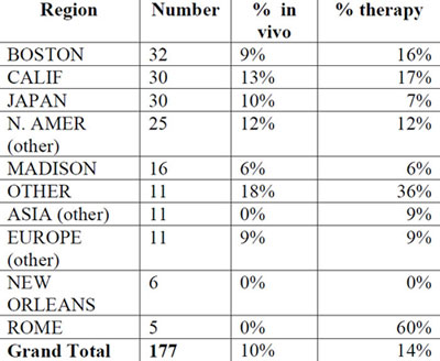 對治療方法進(jìn)行權(quán)利申明的專利或應(yīng)用在非主要專利地區(qū)所占的比例最大。從表2可以看出,羅馬在治療方面的專利占了總量的60%。而“其他(other)”地 區(qū)則在體內(nèi)應(yīng)用專利上所占的比例最大。這些結(jié)果可能反映了數(shù)據(jù)池較小而帶來的統(tǒng)計偏差,或者是反映了較小的研究機(jī)構(gòu)為了避免與在基礎(chǔ)研究方面具有雄厚實力 的大型機(jī)構(gòu)產(chǎn)生直接競爭,而采取的一種策略。