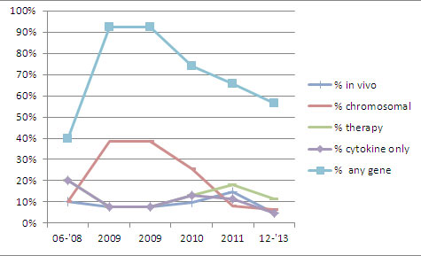 如圖1所示,直接指向誘導(dǎo)多能干細(xì)胞的治療作用的專利在比重上并沒有明顯的變化趨勢,但是用于體內(nèi)治療的技術(shù)在趨勢上則有所偏離。特別是自2009年起,較 少有專利涉及或敘述轉(zhuǎn)化因子OCT,Myc,或 Klf(圖示中的“any gene”數(shù)據(jù)),涉及染色體整合的專利在比重上也有明顯的下降趨勢。這些數(shù)據(jù)說明,誘導(dǎo)多能干細(xì)胞專利正在偏離遺傳轉(zhuǎn)化,但是也沒有完全被取代。